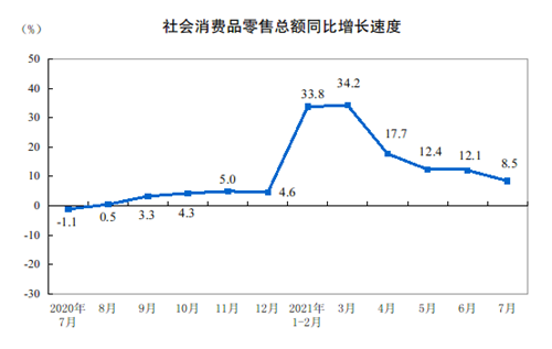 7月份,社會(huì)消費(fèi)品零售總額34925億元,同比增長(zhǎng)8.5%;比2019年7月份增長(zhǎng)7.2%,兩年平均增速為3.6%。其中,除汽車以外的消費(fèi)品零售額31578億元,增長(zhǎng)9.7%?鄢齼r(jià)格因素, 7月份社會(huì)消費(fèi)品零售總額實(shí)際增長(zhǎng)6.4%。