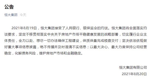 房訊網(wǎng)訊 8月20日凌晨,恒大集團(tuán)在官微發(fā)布公告稱,2021年8月19日,恒大集團(tuán)接受了人民銀行、銀保監(jiān)會的約談。