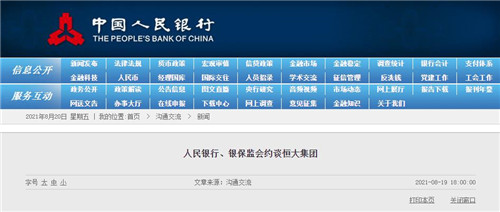 2021年8月19日,人民銀行、銀保監(jiān)會相關(guān)部門負責同志約談恒大集團高管。
