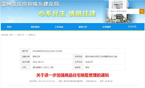 房訊網(wǎng)訊 8月23日,溫州市人民政府發(fā)布《關(guān)于進(jìn)一步加強(qiáng)商品住宅銷售管理的通知》,落實(shí)房地產(chǎn)市場調(diào)控城市主體責(zé)任,切實(shí)加強(qiáng)商品住宅銷售管理,促進(jìn)房地產(chǎn)平穩(wěn)健康發(fā)展。