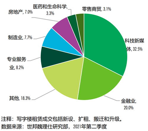 市場租賃成交類型來看,科技新媒體、金融業(yè)及專業(yè)服務業(yè)繼續(xù)擔當主力需求引擎,貢獻租賃成交的33%、20%和8%。