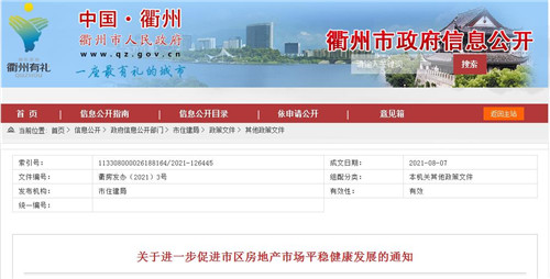 房訊網(wǎng)訊 8月7日,浙江衢州發(fā)布《關(guān)于進(jìn)一步促進(jìn)市區(qū)房地產(chǎn)市場平穩(wěn)健康發(fā)展的通知》,從實(shí)行限購管理、擴(kuò)大限售范圍、加強(qiáng)稅收調(diào)節(jié)、建立二手住房成交參考價格發(fā)布機(jī)制、規(guī)范二手住房房源信息發(fā)布等五個方面入手,促進(jìn)市區(qū)房地產(chǎn)市場平穩(wěn)健康發(fā)展。