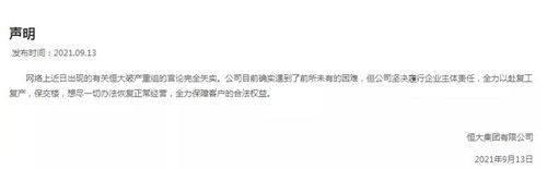 房訊網(wǎng)訊 9月13日晚間,恒大集團(tuán)發(fā)布聲明稱,網(wǎng)絡(luò)上近日出現(xiàn)的有關(guān)恒大破產(chǎn)重組的言論完全失實(shí)。公司目前確實(shí)遇到了前所未有的困難,但公司堅(jiān)決履行企業(yè)主體責(zé)任,全力以赴復(fù)工復(fù)產(chǎn),保交樓,想盡一切辦法恢復(fù)正常經(jīng)營(yíng),全力保障客戶的合法權(quán)益。