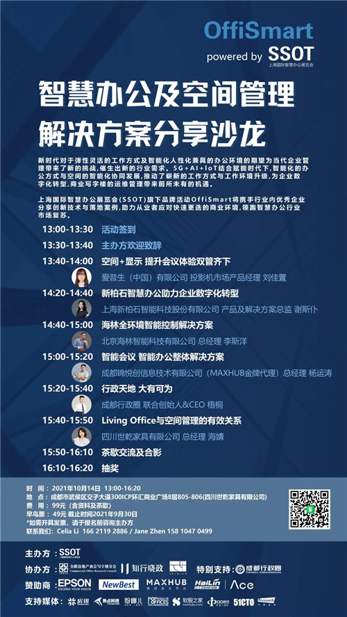 本次OffiSmart智慧辦公及空間管理解決方案分享沙龍—10.14成都站特邀愛(ài)普生、新柏石、海林、成都錦悅創(chuàng)、成都行政圈及世乾家具等企業(yè)探討智慧辦公及商業(yè)空間管理的未來(lái)趨勢(shì),分享創(chuàng)新技術(shù)與落地案例,呈現(xiàn)解決用戶(hù)實(shí)際需求的智慧辦公整體解決方案,助力業(yè)者應(yīng)對(duì)快速更迭的商業(yè)環(huán)境,領(lǐng)跑智慧辦公行業(yè)市場(chǎng)復(fù)蘇。