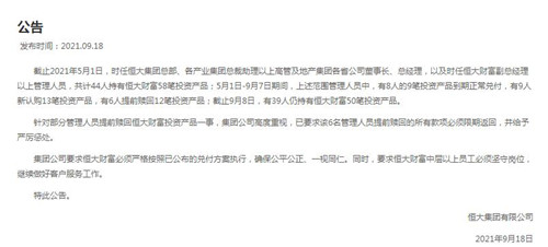 房訊網(wǎng)訊 9月18日凌晨,恒大集團(tuán)官方網(wǎng)站發(fā)布公告稱(chēng),針對(duì)部分管理人員提前贖回恒大財(cái)富投資產(chǎn)品一事,集團(tuán)公司高度重視,已要求該6名管理人員提前贖回的所有款項(xiàng)必須限期返回,并給予嚴(yán)厲懲處。