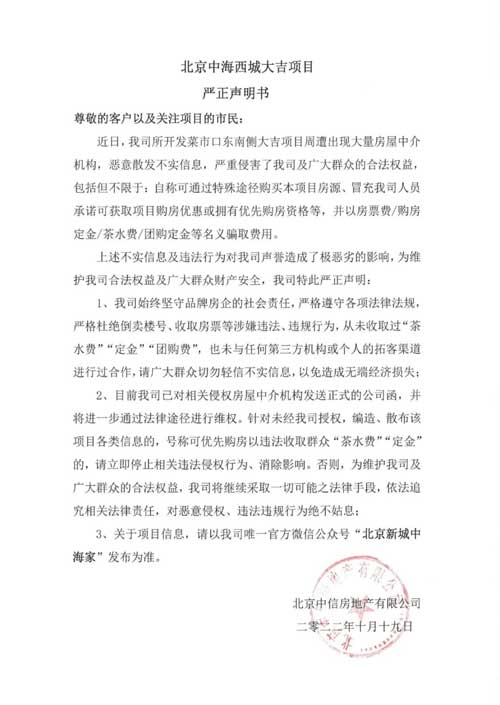 10月19日,北京中信房地產(chǎn)有限公司唯一官方微信公眾號(hào)“北京新城中海家”發(fā)布關(guān)于北京中海西城大吉項(xiàng)目的嚴(yán)正聲明,稱近日公司所開發(fā)菜市口東南側(cè)大吉項(xiàng)目周遭出現(xiàn)大量房屋中介機(jī)構(gòu),惡意散發(fā)不實(shí)信息。聲明表示,公司嚴(yán)格遵守各項(xiàng)法律法規(guī),嚴(yán)格杜絕倒賣樓號(hào)、收取房票等涉嫌違法、違規(guī)行為,從未收取過(guò)“茶水費(fèi)”“定金”“團(tuán)購(gòu)費(fèi)”,也未與任何第三方機(jī)構(gòu)或個(gè)人的拓客渠道進(jìn)行過(guò)合作。