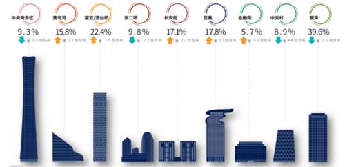 4、因內(nèi)部整合導(dǎo)致部分集團(tuán)性企業(yè)子公司退租重組合并,多個(gè)商圈空置率有明顯上漲致使整體市場空置率達(dá)到15.6%。