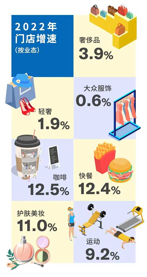 雖然國內(nèi)疫情反復(fù)、全球政治經(jīng)濟(jì)環(huán)境面臨嚴(yán)峻情形,國際品牌在中國內(nèi)地市場整體依然保持同比擴(kuò)張態(tài)勢。2022年的門店平均增速雖然較2021年明顯放緩,但較2020年依然高出2個百分點。