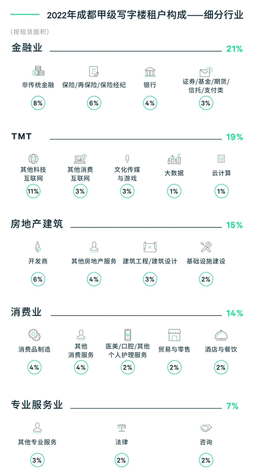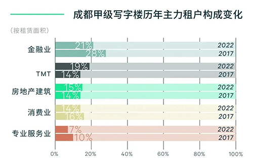 金融業(yè)的需求規(guī)模有所減少,主要是源于非傳統(tǒng)金融業(yè)的需求占比較2017年下降6%。房地產(chǎn)建筑方面,盡管近年來(lái)行業(yè)調(diào)整導(dǎo)致傳統(tǒng)房地產(chǎn)開(kāi)發(fā)商的辦公面積出現(xiàn)一定收縮,但成渝雙城經(jīng)濟(jì)圈和公園城市建設(shè)的雙重機(jī)遇之下,城鎮(zhèn)化進(jìn)程積極推進(jìn),基建工程類企業(yè)擴(kuò)張勢(shì)頭不減,致使房地產(chǎn)建筑的需求占比較2017年仍上升1個(gè)百分點(diǎn)至15%。