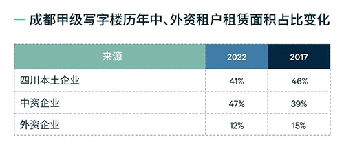 “十四五”期間,成都積極打造全國(guó)重要的經(jīng)濟(jì)、科技、金融、文創(chuàng)、對(duì)外交往中心和國(guó)際綜合交通通信樞紐,對(duì)外開(kāi)放程度進(jìn)一步提升,繼而吸引更多優(yōu)質(zhì)企業(yè)來(lái)蓉發(fā)展。對(duì)比2017年,中資企業(yè)需求占比顯著增長(zhǎng)8個(gè)百分點(diǎn),并首次超越四川本土企業(yè)。