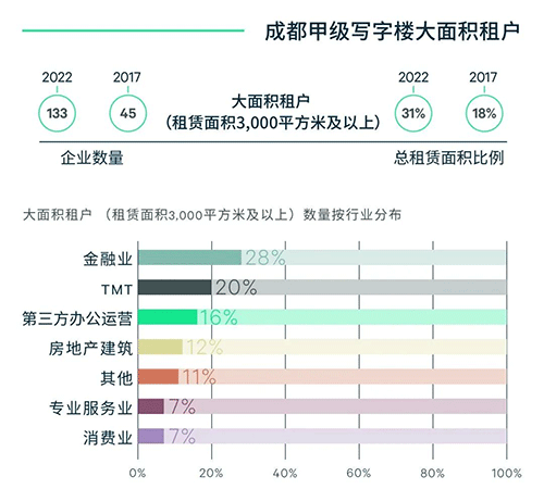 成都謀求高質(zhì)量發(fā)展新支點(diǎn),塑造總部經(jīng)濟(jì)新格局,而不斷發(fā)展的寫(xiě)字樓市場(chǎng)規(guī)模與質(zhì)量為這一聚勢(shì)提供了土壤。一方面,更多頭部企業(yè)在蓉布局,設(shè)立區(qū)域型總部;另一方面,積極培育本土企業(yè),逐步形成總部效應(yīng)。普查數(shù)據(jù)顯示,面積需求在3,000平方米及以上的大面積租戶數(shù)量成倍增長(zhǎng),從2017年的45家增長(zhǎng)至2022年的133家,其所租用的辦公面積在整體需求中的占比也相應(yīng)地?cái)U(kuò)大,上升13個(gè)百分點(diǎn)至31%。從行業(yè)端看,金融業(yè)和TMT主導(dǎo)大面積段需求,分別占比28%和20%。