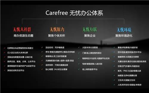 據(jù)房訊指數(shù)觀察,目前多家頭部企業(yè)已經(jīng)積極擁抱數(shù)字化,推出智慧服務(wù)平臺,包括中海商務(wù)APP、華潤CR Union智慧云辦公平臺、大悅城COFFICE、金地商置Carefree辦公體系等。其中金地商置Carefree體系包含無憂大社群——企業(yè)資源生態(tài)圈、無憂原力——聚焦個體關(guān)懷、無憂互聯(lián)——聚焦企業(yè)生長、無憂健康——聚焦環(huán)境凈化四個模塊,26個細(xì)項。