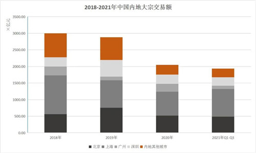 數(shù)據(jù)顯示,前三季度主要城市大宗交易市場累計成交162宗,錄得成交額約1900億元,已接近去年全年2000億元的成交額度,較2019年依舊有所不足,但已經(jīng)表現(xiàn)出明顯的回暖態(tài)勢。