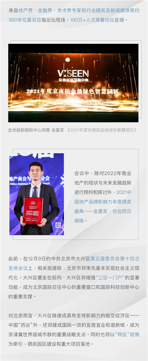 1月6日,中國寫字樓產(chǎn)業(yè)園發(fā)展論壇第十八屆年會在北京富力萬麗酒店舉行,論壇上除對2022年商業(yè)地產(chǎn)的現(xiàn)狀與未來發(fā)展趨勢進行預(yù)判和探討外,2021中國地產(chǎn)金廈獎也在同日揭曉,金地威新國際中心榮膺金廈獎“2021年度京南鉑金級綠色智慧園區(qū)”。