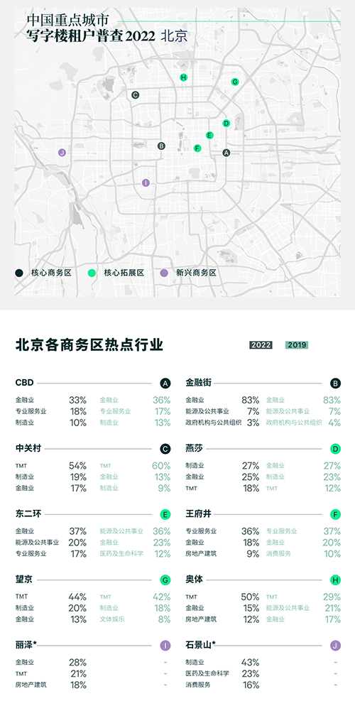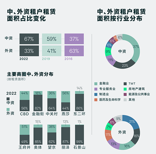 中資金融、TMT、專業(yè)服務(wù)等行業(yè)企業(yè)近年在京不斷擴張,且對辦公品質(zhì)的要求不斷提升,逐步成為北京甲級寫字樓租賃需求的中流砥柱,其中中資租戶在金融街、東二環(huán)、奧體和各新興商務(wù)區(qū)更是占有絕對優(yōu)勢。