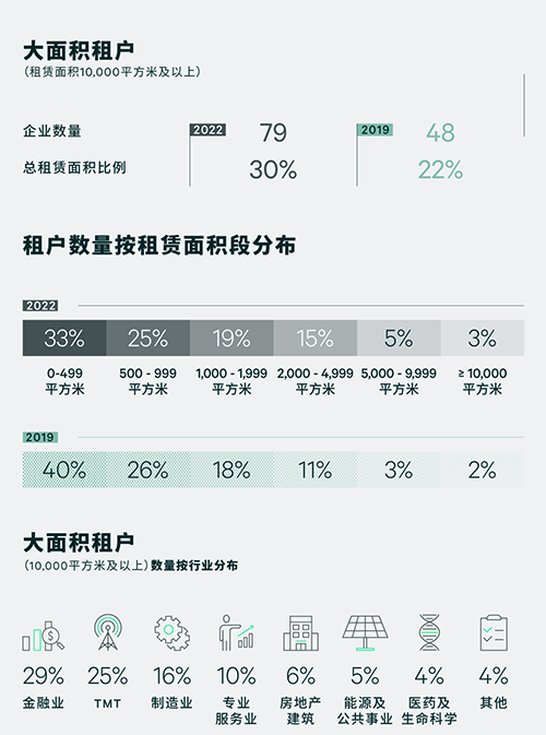 過去三年,進入“萬平級”俱樂部的甲級寫字樓租戶數(shù)量從48上升至79,總租賃面積占比從22%上升至30%,這一方面要歸功于金融、TMT和專業(yè)服務(wù)等行業(yè)頭部中資企業(yè)的發(fā)展壯大,另一方面受益于過去三年的供應(yīng)潮,各類大型企業(yè)獲得更多擴大、騰挪、整合辦公空間的機會。