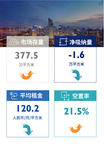 2022年第三季度,位于濱江商圈的海威領(lǐng)界項目交付入市,為杭州甲級寫字樓市場帶來約11萬平方米的寫字樓可租賃建筑面積;面臨租賃市場需求放緩及新增供應(yīng)持續(xù)放量,全市甲級寫字樓市場凈吸納量環(huán)比降低,于本季度錄得-1.6萬平方米;由于新項目竣工進入市場,杭州甲級寫字樓市場空置率環(huán)比提高至21.5%;甲級寫字樓市場平均租金在不同商圈出現(xiàn)漲跌互現(xiàn)的局面,杭州甲級寫字樓市場平均租金環(huán)比上季度微降0.5%至120.2元每平方米每月;