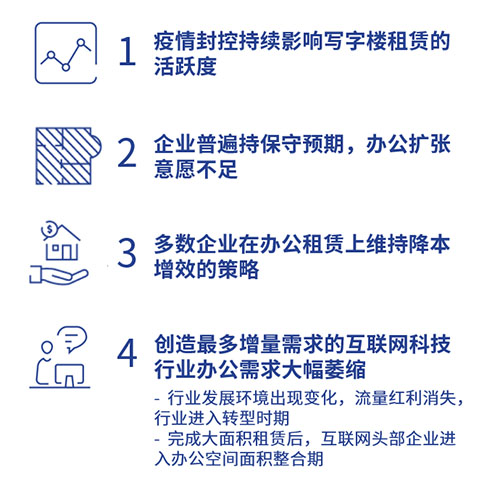 在沒(méi)有新增供應(yīng)壓力的情況下,市場(chǎng)行情出現(xiàn)快速反轉(zhuǎn),部分子市場(chǎng)空置率出現(xiàn)大幅上升主要是由于需求不足和退租面積增多所致。影響2022年市場(chǎng)需求走勢(shì)的四個(gè)核心因素: