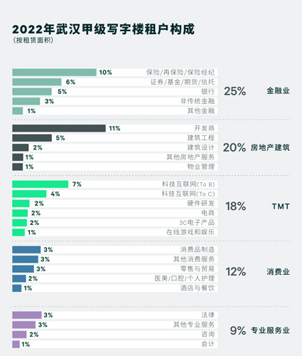 金融業(yè)、房地產(chǎn)建筑、TMT為武漢甲級寫字樓租戶前三大主力,且占比遙遙領(lǐng)先,三大行業(yè)在全市甲級樓宇租戶中占比超過63%。從細(xì)分行業(yè)來看,金融業(yè)中的保險/再保險/保險經(jīng)紀(jì)、房地產(chǎn)建筑中的開發(fā)商、TMT中的科技互聯(lián)網(wǎng)(To B)在整體市場需求所占比重分別達(dá)到10%、11%和7%,均在所在行業(yè)內(nèi)部表現(xiàn)亮眼。