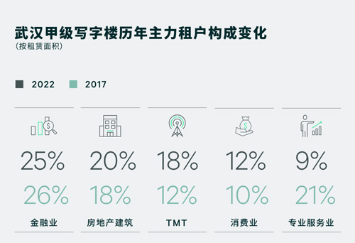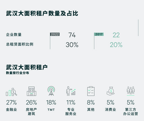 租賃面積3,000平方米及以上的大面積租戶數(shù)量在五年內(nèi)成倍增長,從2017年的22家上升至2022年的74家,租賃面積占比上升10個百分點(diǎn)至30%。大面積租戶的增長主要來自于金融業(yè)、房地產(chǎn)建筑和TMT行業(yè)的中資頭部企業(yè)在武漢設(shè)立區(qū)域總部,形成總部經(jīng)濟(jì)效應(yīng),持續(xù)推動大面積租賃去化。