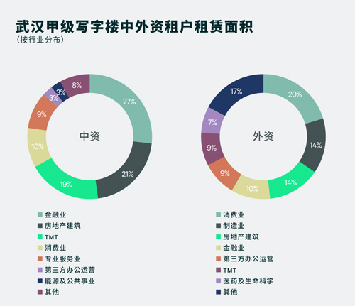 相比之下,外資企業(yè)雖在需求占比上有所收縮,但租賃面積穩(wěn)步上升,并且表現(xiàn)出更強(qiáng)的行業(yè)導(dǎo)向作用,以領(lǐng)事館、消費(fèi)業(yè)、制造業(yè)、醫(yī)藥及生命科學(xué)為代表的外資企業(yè)在武漢穩(wěn)步擴(kuò)張。