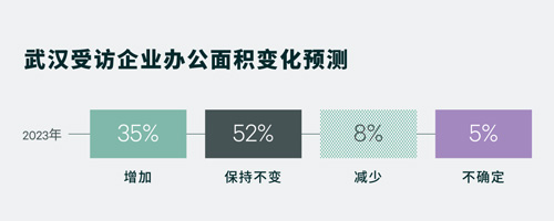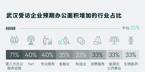 由于企業(yè)裝修支出預(yù)算減少,同等價格下,租戶更愿意選擇能夠拎包入住的精裝修產(chǎn)品。順應(yīng)這一市場需求,71%的第三方辦公服務(wù)營運(yùn)企業(yè)預(yù)計(jì)將在2023年擴(kuò)張租賃面積。同時,TMT、專業(yè)服務(wù)、金融業(yè)均表現(xiàn)出高于武漢受訪企業(yè)平均值的擴(kuò)張意愿。