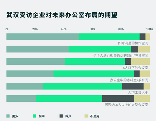 未來辦公場景需滿足團(tuán)隊(duì)協(xié)作的溝通需求,同時為個人封閉空間提供預(yù)留地。本次調(diào)查數(shù)據(jù)顯示,分別有51%和41%的受訪企業(yè)意愿增加即時溝通的協(xié)作空間和5人以下小型會議室,同時44%的受訪企業(yè)將增加供個人視頻通話的封閉/隔音空間。