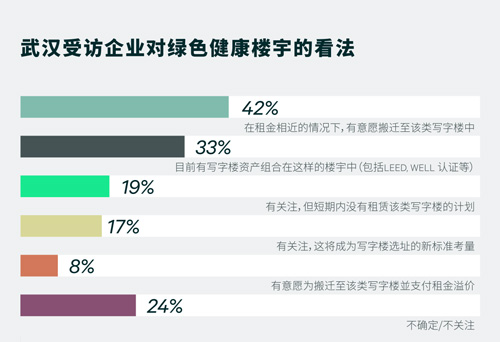 在本次調(diào)查中,超過七成的武漢受訪企業(yè)不同程度關(guān)注綠色樓宇,42%的企業(yè)在租金相近情況下愿意搬至綠色樓宇,已有33%的受訪企業(yè)目前正在使用綠色樓宇。8%武漢受訪企業(yè)表示愿意為綠色樓宇支付租金溢價。
