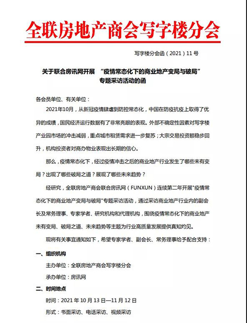 10月13日起,全聯(lián)房地產(chǎn)商會(huì)聯(lián)合房訊網(wǎng)(FUNXUN),再度開展"中國(guó)房地產(chǎn)50人"專題采訪行動(dòng),包括新商辦50人、新園區(qū)50人專題采訪行動(dòng),通過采訪商業(yè)地產(chǎn)行業(yè)內(nèi)的副會(huì)長(zhǎng)及常務(wù)理事、專家學(xué)者、研究機(jī)構(gòu)和代理機(jī)構(gòu),采集行業(yè)意見,聆聽大咖聲音,揭秘疫情防控常態(tài)化下寫字樓產(chǎn)業(yè)園市場(chǎng)現(xiàn)狀,探尋行業(yè)創(chuàng)新發(fā)展路徑,揭幕中國(guó)商業(yè)地產(chǎn)高質(zhì)量發(fā)展的下一個(gè)十年。