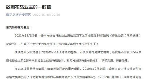 房訊網(wǎng)訊 1月3日夜間,恒大童世界集團(tuán)在官微發(fā)布《致海花島業(yè)主的一封信》,稱2021年12月30日,儋州市綜合行政執(zhí)法局給我司下發(fā)了;◢u39棟建筑《行政處罰(限期拆除)決定書》,引起了廣大業(yè)主的高度關(guān)注。