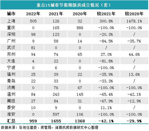 房訊網(wǎng)訊 2022年春節(jié)假期,樓市成交活躍度一般,未及去年同期水平。根據(jù)諸葛找房數(shù)據(jù)研究中心監(jiān)測數(shù)據(jù)顯示,2022年春節(jié)假期重點15城新房成交959套,創(chuàng)近五年春節(jié)成交新低,同比去年春節(jié)下跌42.1%。