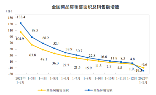 1—2月份,商品房銷售面積15703萬平方米,同比下降9.6%,其中,住宅銷售面積下降13.8%;商品房銷售額15459億元,下降19.3%,其中,住宅銷售額下降22.1%。