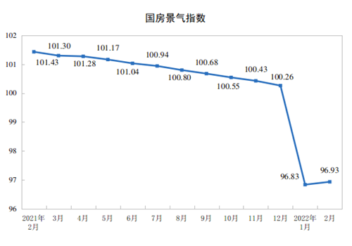 2月份,房地產(chǎn)開發(fā)景氣指數(shù)(簡稱“國房景氣指數(shù)”)為96.93。