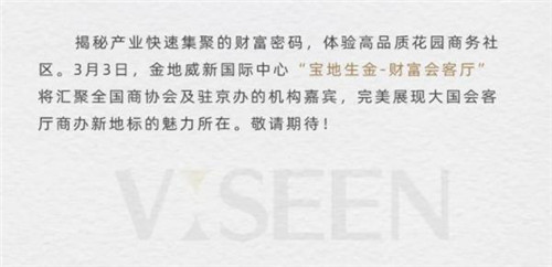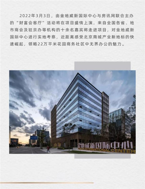 3月3日,由金地威新國際中心與房訊網(wǎng)聯(lián)合主辦的“財富會客廳”活動將在項目盛情上演,來自全國各省、地市商會及駐京辦等機構(gòu)的十余名嘉賓將走進項目,對金地威新國際中心進行實地考察,近距離感受北京南城產(chǎn)業(yè)新地標的快速崛起,領略22萬平米花園商務社區(qū)中無界辦公的魅力。