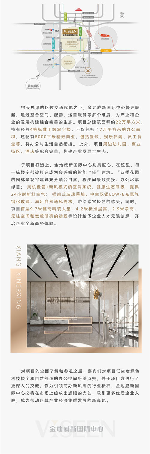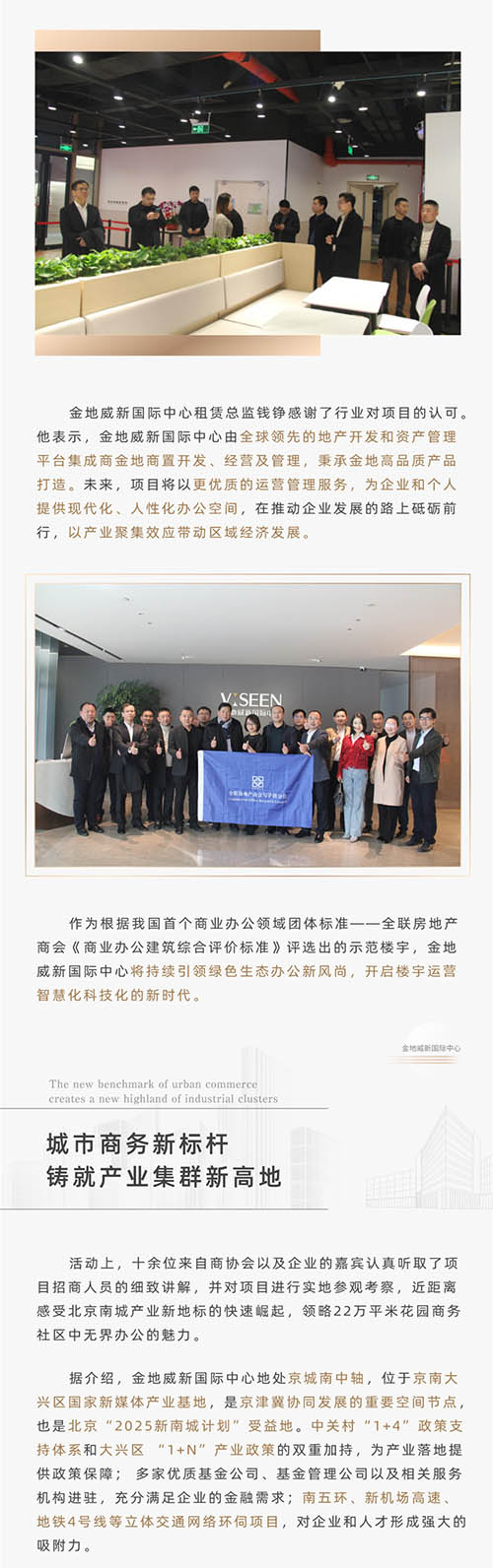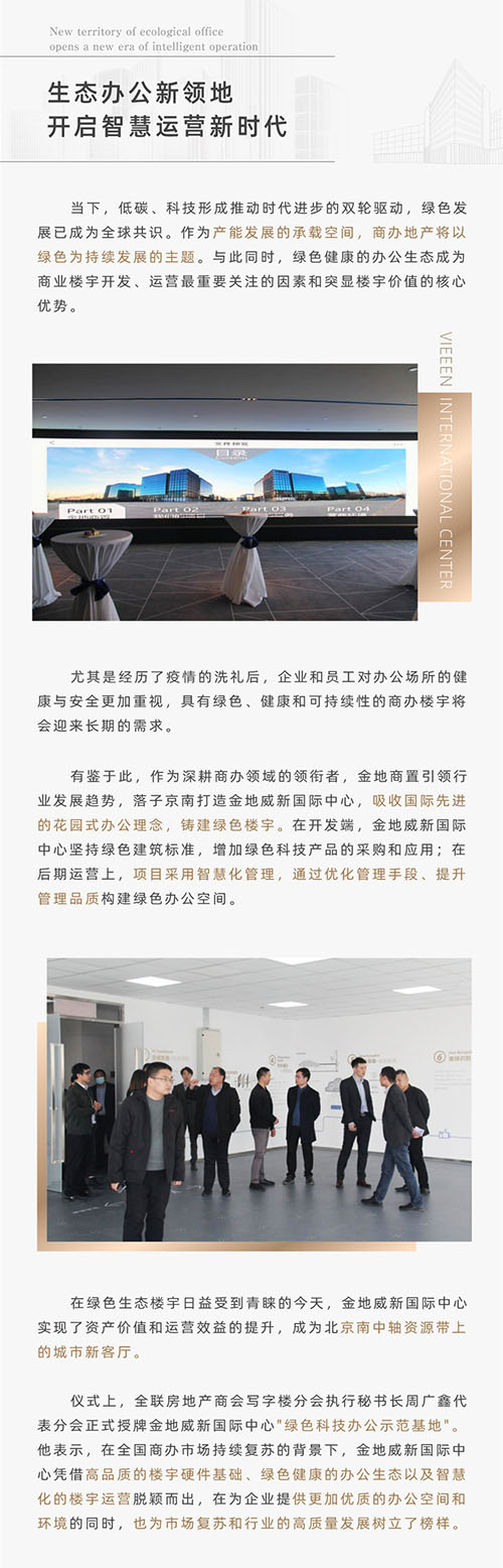 房訊網(wǎng)訊 2022年3月3日,以“寶地生金—財富會客廳”為主題的金地威新國際中心商協(xié)會品鑒行活動成功舉辦,金地威新國際中心在活動上獲全聯(lián)房地產(chǎn)商會寫字樓分會正式授牌,榮膺“綠色科技辦公示范基地”稱號。
