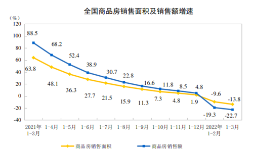 1—3月份,商品房銷售面積31046萬平方米,同比下降13.8%;其中,住宅銷售面積下降18.6%。商品房銷售額29655億元,下降22.7%;其中,住宅銷售額下降25.6%。
