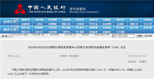 房訊網(wǎng)訊 中國人民銀行授權(quán)全國銀行間同業(yè)拆借中心公布,2022年4月20日貸款市場報價利率(LPR)為:1年期LPR為3.7%,5年期以上LPR為4.6%,已連續(xù)三個月維持不變。