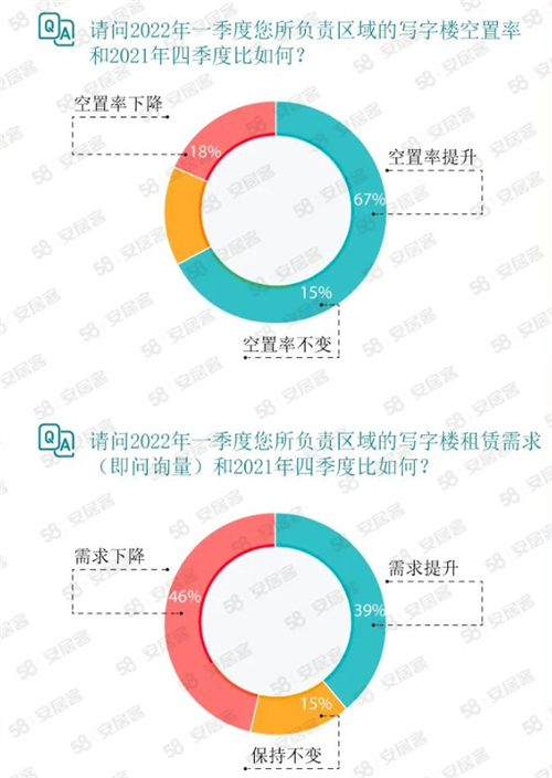 一直以來,經(jīng)紀人對于市場變化極其敏銳,58安居客房產(chǎn)研究院調(diào)研數(shù)據(jù)顯示,2022年一季度商業(yè)地產(chǎn)經(jīng)紀人信心指數(shù)為86.36。在接受調(diào)研的經(jīng)紀人中,有66%的經(jīng)紀人認為自己負責區(qū)域的寫字樓租金有所下降,還有27%的經(jīng)紀人表示租金不變。有18%的經(jīng)紀人認為一季度所負責區(qū)域的寫字樓空置率有所下降,另有39%的經(jīng)紀人認為一季度租賃需求要比2021年四季度有所提升。