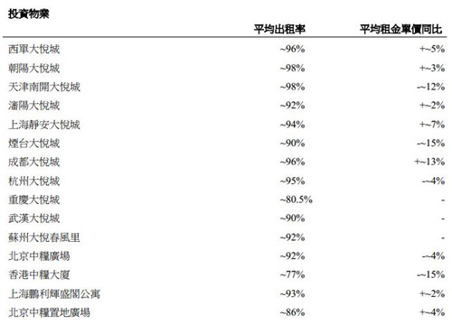 投資物業(yè)方面,目前大悅城地產旗下共有15處投資物業(yè),包含了商業(yè)物業(yè)、寫字樓以及公寓等業(yè)態(tài)。除重慶大悅城、香港中糧大廈和北京中糧置地廣場外,大多數(shù)投資物業(yè)出租率在90%以上,其中朝陽大悅城和天津南開大悅城以98%的出租率領居于首位。從租金來看,香港中糧大廈和煙臺大悅城以平均租金單價波動較大,同比出現(xiàn)了15%的降幅;而成都大悅城則實現(xiàn)了平均租金單價同比13%的漲幅。