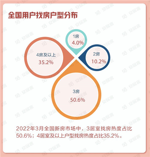 找房戶型分布方面,2022年3月全國新房市場中,3居室找房熱度占比50.6%;4居室及以上戶型找房熱度占比35.2%。