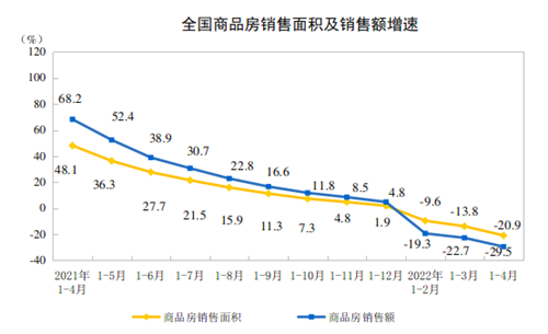 1—4月份,商品房銷售面積39768萬(wàn)平方米,同比下降20.9%;其中,住宅銷售面積下降25.4%。商品房銷售額37789億元,下降29.5%;其中,住宅銷售額下降32.2%。