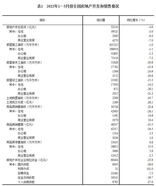 1—5月份,房地產(chǎn)開發(fā)企業(yè)房屋施工面積831525萬平方米,同比下降1.0%。其中,住宅施工面積586918萬平方米,下降1.1%。房屋新開工面積51628萬平方米,下降30.6%。其中,住宅新開工面積37782萬平方米,下降31.9%。房屋竣工面積23362萬平方米,下降15.3%。其中,住宅竣工面積17050萬平方米,下降14.2%。