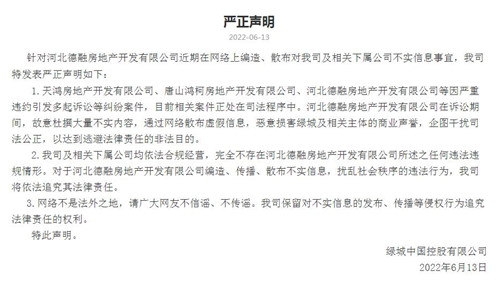 綠城集團(tuán)對(duì)此發(fā)布“嚴(yán)正聲明”表示,天鴻房地產(chǎn)開(kāi)發(fā)有限公司、唐山鴻柯房地產(chǎn)有限公司、河北德融房地產(chǎn)有限公司,因嚴(yán)重違約,引發(fā)多起訴訟等糾紛案件,目前相關(guān)案件正處于司法流程中。