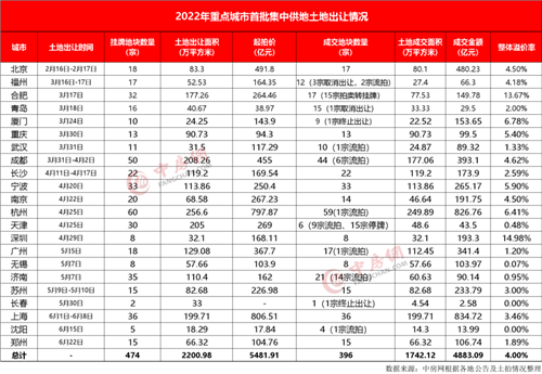 據(jù)中房網(wǎng)不完全統(tǒng)計,今年22城首批集中供地總成交住宅用地(含綜合用地)396宗,土地成交面積1742.12萬平方米,土地出讓金總額達4883.09億元,整體溢價率約為4%。