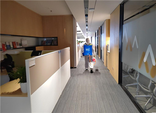 寫(xiě)字樓的疫情防控同樣體現(xiàn)出科技在疫情防控中的重要作用。譬如我們?cè)诶鲋行目吹,該?xiě)字樓正在疫情防控上利用氣壓噴霧器、藍(lán)光納米消毒噴槍等多種“硬核武器”每日對(duì)公共區(qū)域進(jìn)行3-4次全覆蓋消毒,充分保障樓內(nèi)防疫安全,避免疫情反撲。