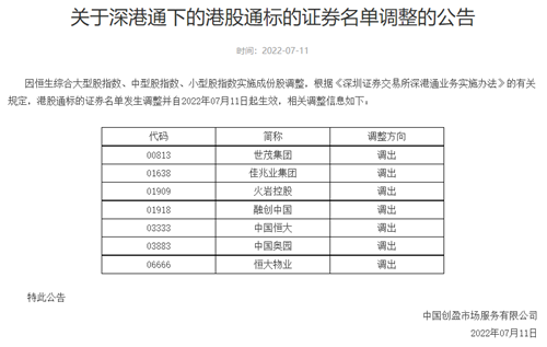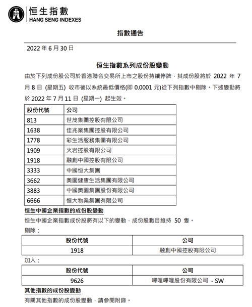根據(jù)公告顯示,世茂集團(tuán)、佳兆業(yè)集團(tuán)、融創(chuàng)中國、火巖控股、中國恒大、中國奧園和恒大物業(yè)均被調(diào)出。