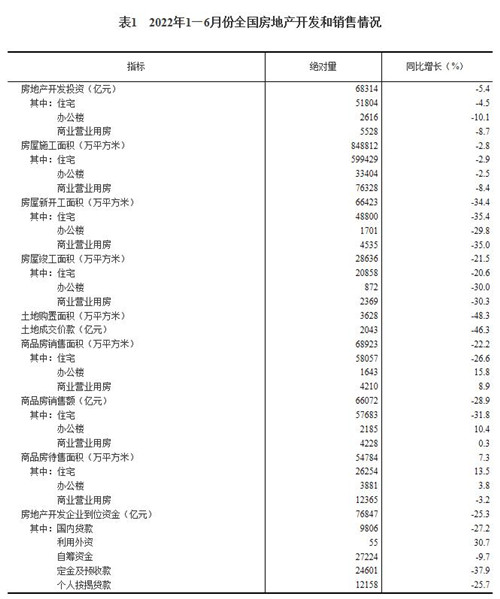 1—6月份,房地產(chǎn)開發(fā)企業(yè)房屋施工面積848812萬平方米,同比下降2.8%。其中,住宅施工面積599429萬平方米,下降2.9%。房屋新開工面積66423萬平方米,下降34.4%。其中,住宅新開工面積48800萬平方米,下降35.4%。房屋竣工面積28636萬平方米,下降21.5%。其中,住宅竣工面積20858萬平方米,下降20.6%。