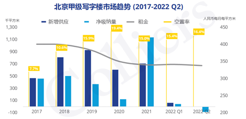 從北京市場來看,受到疫情和頭部互聯(lián)網(wǎng)公司面積整合影響,市場整體活躍度降低。高力國際數(shù)據(jù)顯示,二季度北京甲級寫字樓市場的凈吸納量為-8.3萬平方米,這是繼2020年一季度后第一次出現(xiàn)負(fù)值。季度內(nèi)市場無新增供應(yīng),受到市場租賃活動(dòng)放緩、談判周期延長等因素影響,整體空置率小幅回升到16.4%,市場租金也小幅回調(diào)至338.6元每月每平米。