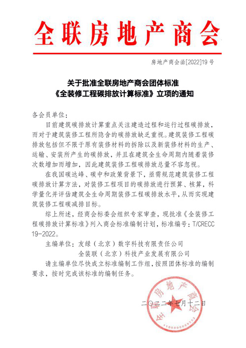 在綠色、節(jié)能、低碳、健康的產(chǎn)業(yè)發(fā)展大背景下,在全聯(lián)房地產(chǎn)商會的指導(dǎo)下,全裝聯(lián)(北京)科技產(chǎn)業(yè)發(fā)展有限公司、友綠(北京)數(shù)字科技有限責(zé)任公司聯(lián)合推動的《全裝修工程碳排放計(jì)算標(biāo)準(zhǔn)》于2022年7月12日成功立項(xiàng),標(biāo)準(zhǔn)編號為:T/CRECC19-2022。本標(biāo)準(zhǔn)旨在規(guī)范建筑裝飾裝修工程碳排放計(jì)算方法,幫助項(xiàng)目裝飾裝修工程的碳排放預(yù)算、核算。