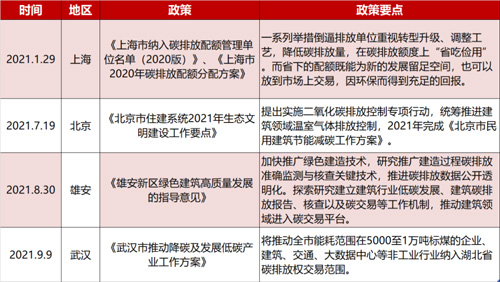 目前北京、上海、武漢、深圳已經(jīng)開始出臺相關(guān)政策,推動建筑領(lǐng)域進(jìn)入碳交易平臺。